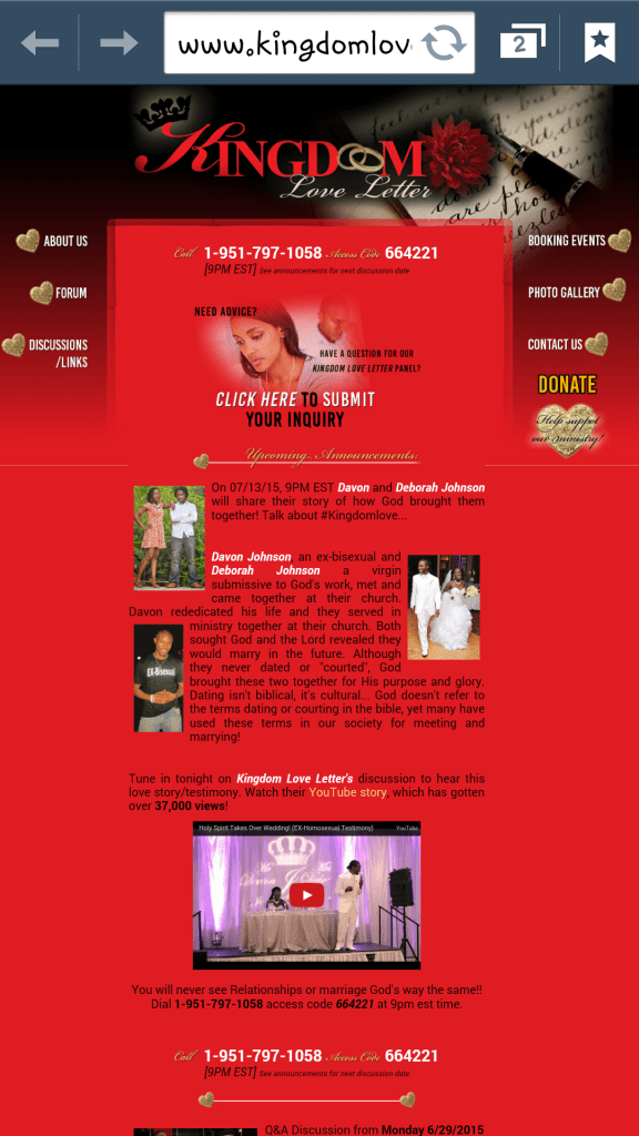 I will share some of my testimony about being delivered from bisexuality, and both my wife and I will share our testimony on how God brought us together. We’ll also be sharing relationship advice. Those who call in will get a chance to ask us questions. To send in your questions anonymously, go to: http://www.kingdomloveletter.com/. Otherwise, at 9 pm EST, call 1-951-797-1058. Access code 664221.